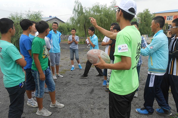 7月22日早8时整,pp电子游戏平台网站“科技点亮乡村”社会实践队伍在巨源第一中学校给小朋友们开展了橄榄球入门活动。此次活动的主讲人为pp电子游戏平台网站团副苗梦亮、张广朋和校橄榄球队队员、pp电子游戏平台网站学生会主席王远达。