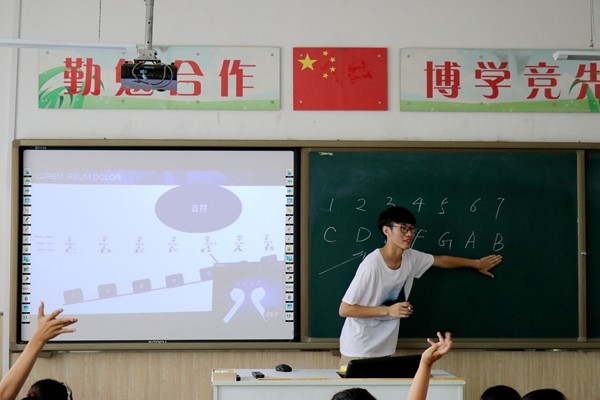 在本次课堂中,丛明坤通过讲解人类是如何发声,激发了同学们的兴趣,从而切入课题向同学们介绍了一些发音、歌唱技巧,并得到了同学们积极响应,纷纷跟随着他认真练习起来。在丛明坤的鼓励和带领下,同学们展示了小合唱,随后,一起开始了基本乐理知识的学习。在本次小课堂中,丛明坤对表现良好的同学进行奖励,并与他们合影留念。