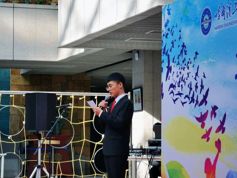 主持人陶哲在台上为同学们介绍本次活动的嘉宾。