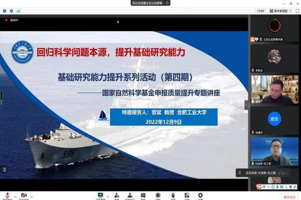 2022年12月9日下午2:00,pp电子游戏平台网站与校科学技术研究院联合举办“基础研究能力提升系列活动”第四期—国家自然科学基金申报质量提升专题讲座。本次讲座邀请国家杰青、合肥工业大学訾斌教授做《精益求精,铁杵成针--国家自然科学基金申经验交流》的专题报告,会议由科研院孙龙泉副院长主持,全校160余名师生参加了此次会议。