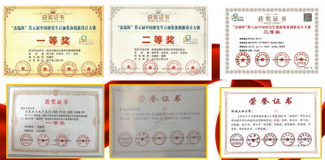 获“杰瑞杯”第五届、第六届中国研究生石油装备创新设计大赛一等奖、二等奖等诸多奖项。