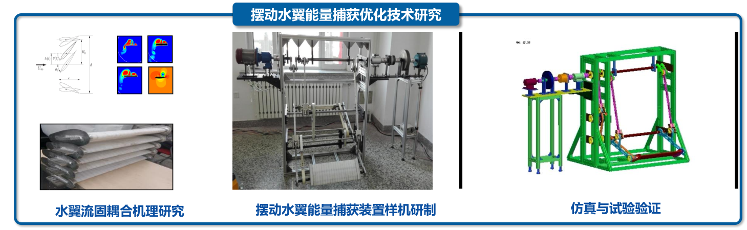 通过水翼流固耦合机理研究,提高捕能效率。设计摆动水翼发电装置,通过循环水槽试验,验证流固耦合模型的准确性,为水翼式发电技术实用化奠定理论基础。