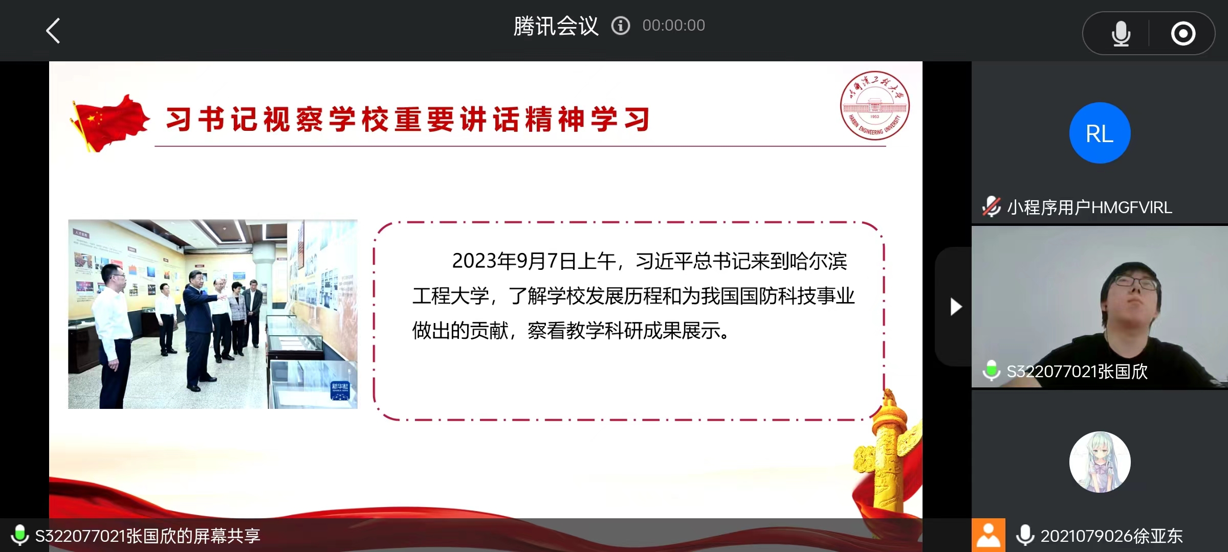 本科生第一党支部徐亚东结合学业生涯规划,宣讲习近平总书记视察pp电子游戏平台网站重要讲话精神。首先,他给出了学生生涯规划的建议。之后,他号召学弟学妹们珍惜时间,最后,他强调:作为哈军工传人,我们要牢记习总书记嘱托,努力学习,刻苦钻研,不忘初心,砥砺前行,让青春在全面建设社会主义现代化国家的火热实践中绽放绚丽火花!