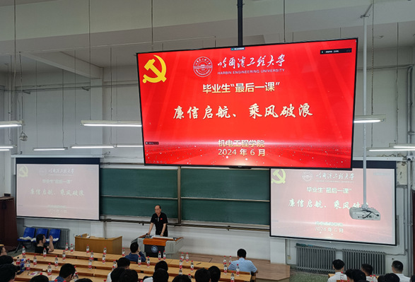 为加强毕业生廉洁教育,吕春雷书记以“廉信启航、“诚”风破浪”题为即将踏上新征程毕业生上“最后一课”。他指出,廉洁自律、诚实守信不仅是研究生在学术道路上积累的宝贵财富,更是未来在个人发展过程中立足的根本。他结合党的纪律学习教育案例,深入浅出地向毕业生们讲述了廉洁自律、诚实守信的重要性,并就如何在工作和生活中践行这一理念提出了具体可行的建议。他强调,廉洁自律是每一位青年学子的必修课,只有坚守道德底线,严于律己,才能在复杂多变的社会环境中保持清醒的头脑和坚定的立场。同时,他也强调了诚实守信的价值,认为真诚守信是赢得他人尊重和认可的关键。他鼓励毕业生们要秉持这一信念,在未来的工作和生活中不断锤炼自己的品行修养。他激励毕业生们要继承和发扬哈军工的优良传统,以科技报国为己任,努力成为报效祖国、造福人民的中坚力量。他鼓励毕业生们要勇于担当、敢于创新,以实际行动书写属于自己的辉煌篇章。