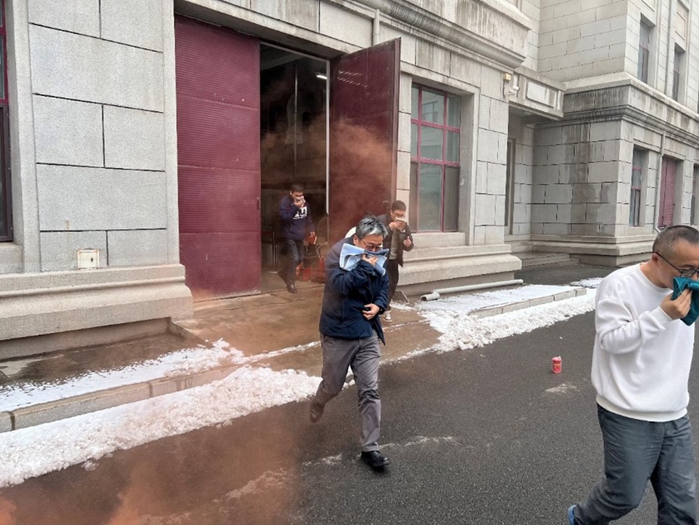 本次消防培训演练采取实战模式,分三个阶段和两个场景进行。第一阶段是消防安全常识培训,提升全体师生的消防安全意识和强化基本消防常识;第二阶段是摸拟培训现场和某学生工作室真实火情,设置火灾初期组织灭火、火情扩大报告求援、火情失控报警后紧急疏散等演练科目;第三阶段是全体人员室外集合进行灭火器材实操演练。