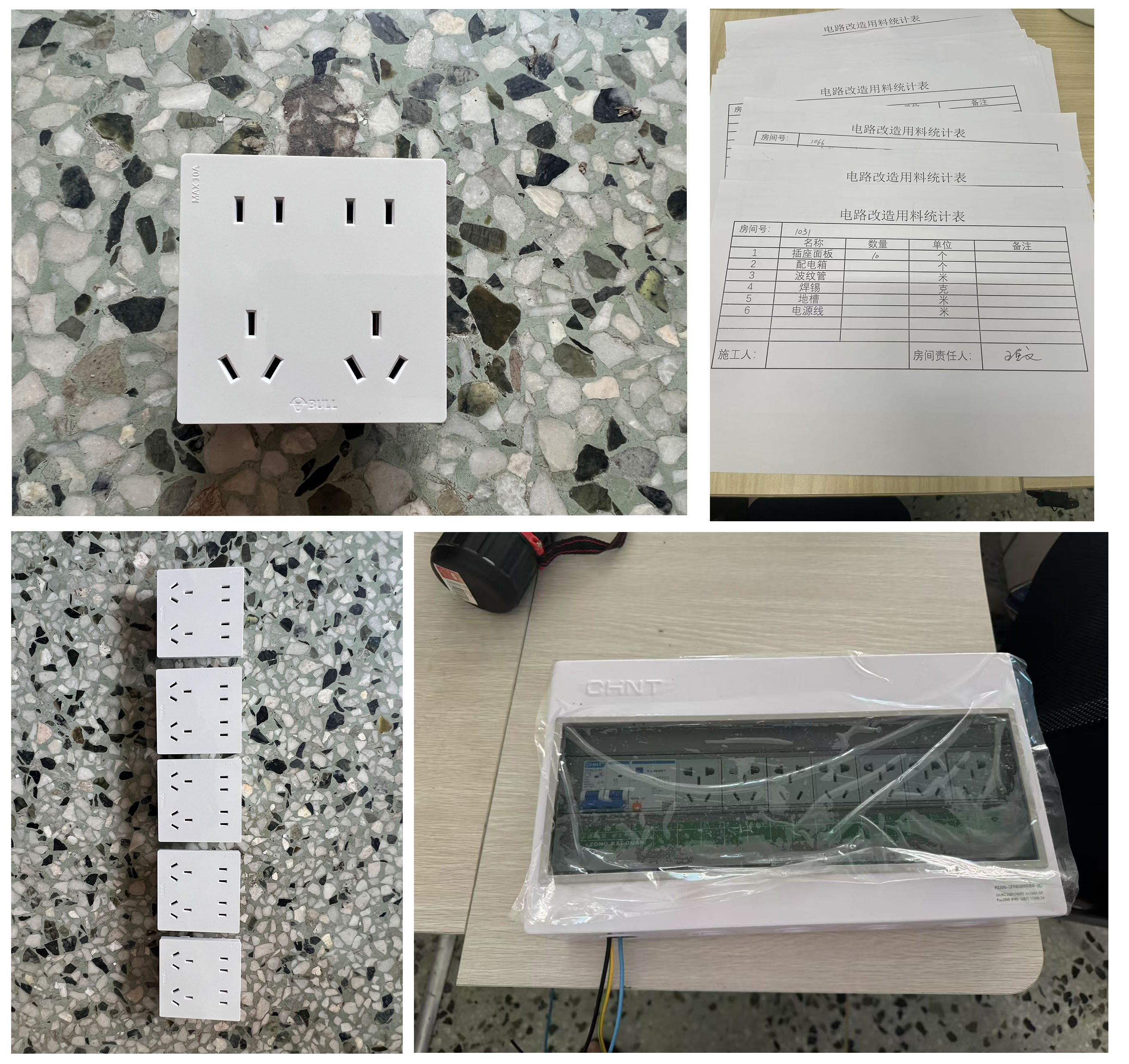 基于以上调研和思考,pp电子游戏平台网站领导班子高度重视用电安全,拨发经费并成立专班。学院首先对全院各房间的用电设备及用电需求进行了全面细致的统计和评估,依据实际情况通过新增小型配电箱、更换新国标多孔入墙插座的方法科学规划用电线路。随后,在不影响学院正常教学和科研秩序的前提下施工团队有条不紊地开展改造工作。施工期间,工作人员严格遵守电气安装规范,选用优质的电线、配电箱等材料,确保改造质量。对于一些老旧线路,也同步进行了更新换代,进一步提升了用电安全性。